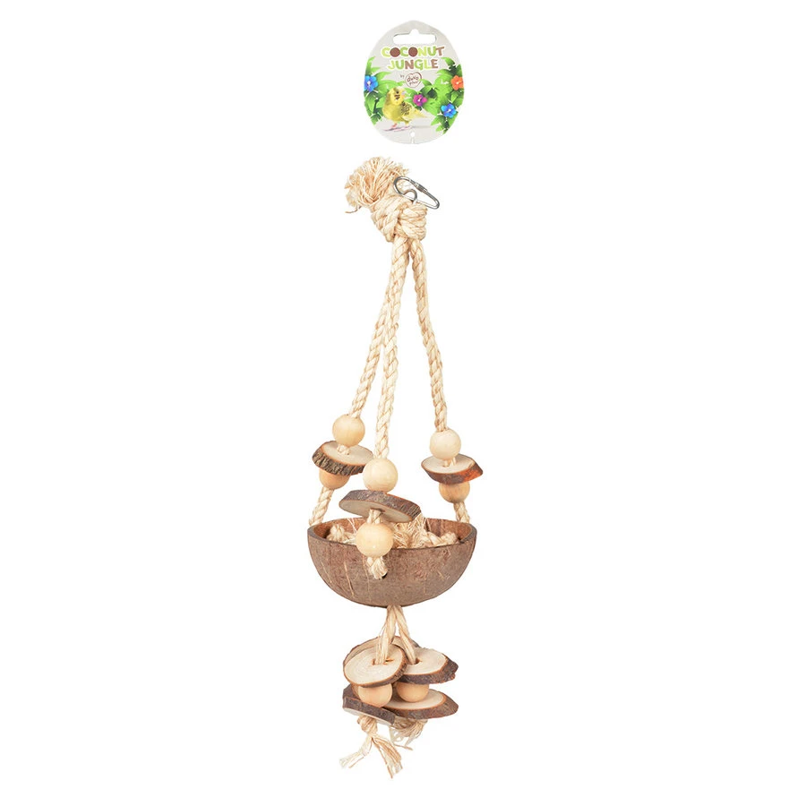 Deze Coconut jungle schommel is het ideale speelgoed voor uw vogels of knaagdieren. Het is ook een perfect speeltje om snacks in op te verbergen en houd uw dieren uren bezig met klimmen en spelen. Gemaakt van kokosnoten, sisaltouw en houten pareltjes en heeft een houtkleurig kleur. De hanger is makkelijk te bevestigen in iedere volière of kooi.