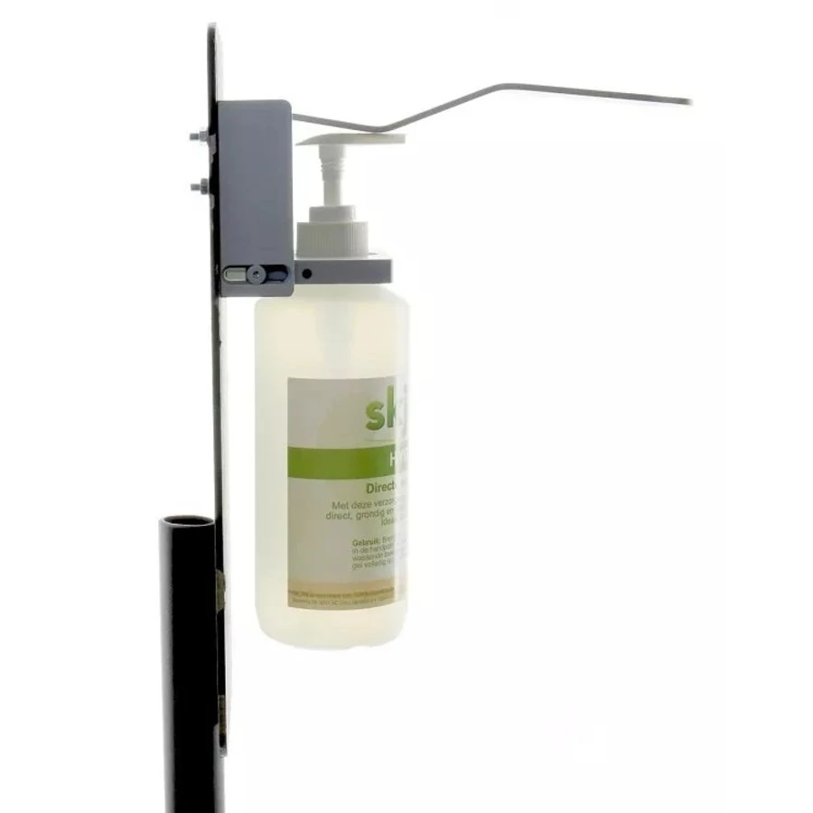 In deze houder kunt u een fles met doseerpomp plaatsen zodat het desinfecteren van de handen eenvoudig wordt.