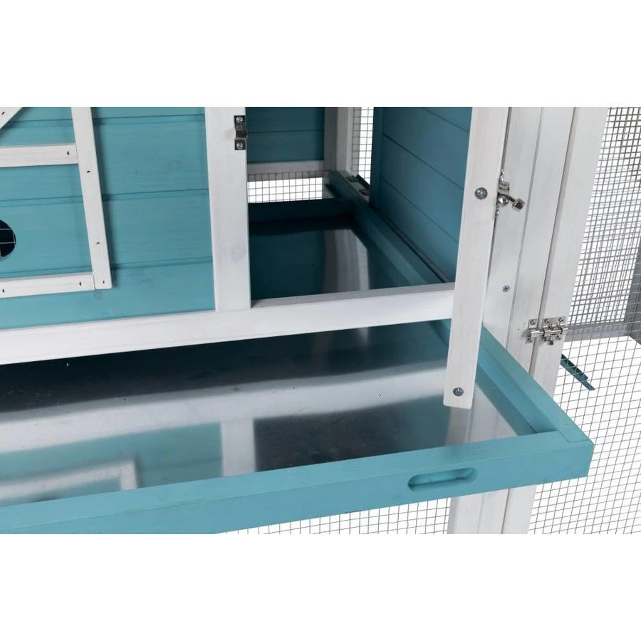 Het hok is makkelijk te verschonen door de uitschuifbare plaat. De ren beschikt over twee deurtjes.